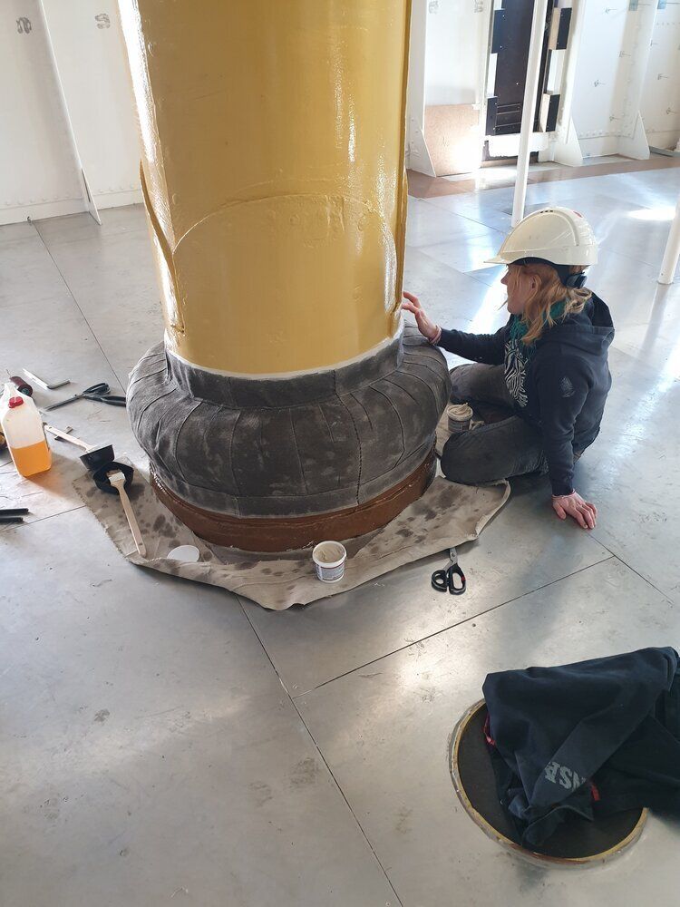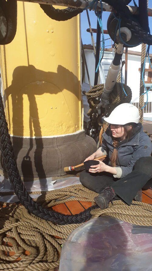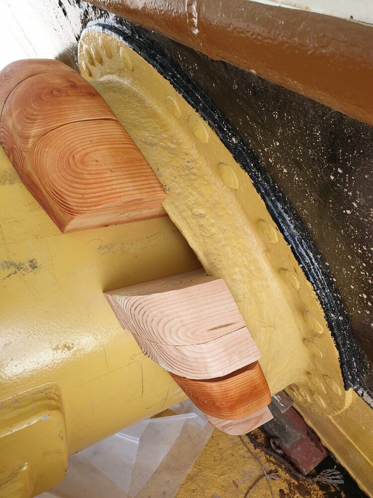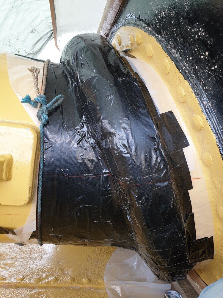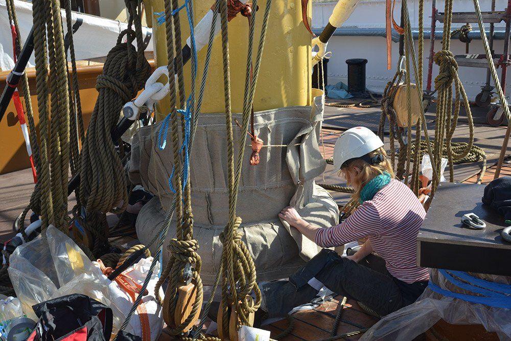 Først var vi ombord og lave skabeloner, der konverteres til kraver i 2 lag hørdug. Efter montering imprægneres og tætnes dugen med linolie og linoliemaling. Specielt brovspryds-kraven bød på lidt udfordringer, da intet er symmetrisk og vi måtte ligge ude i badekarret under processen.