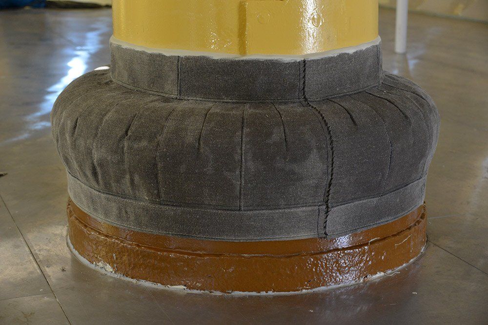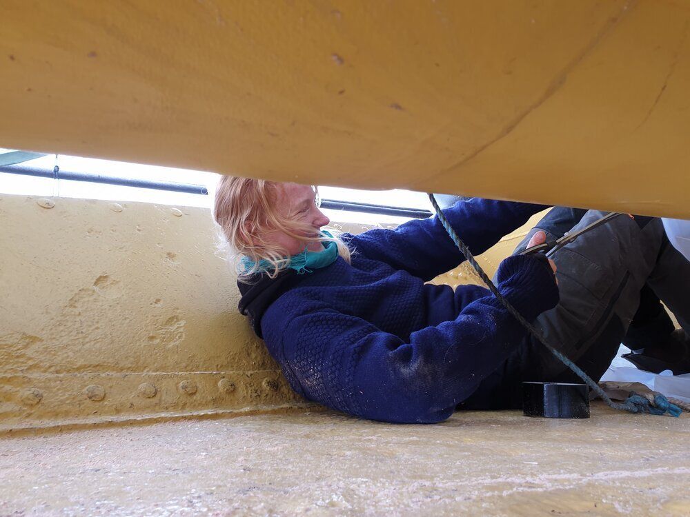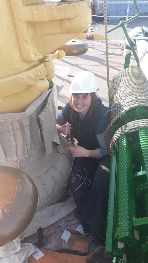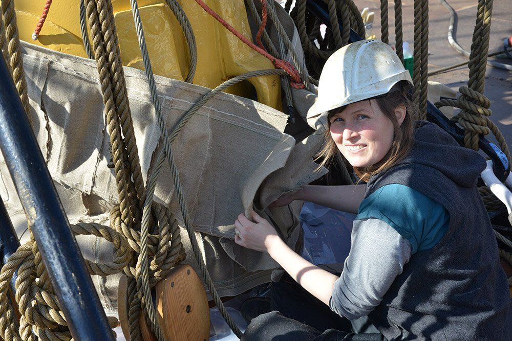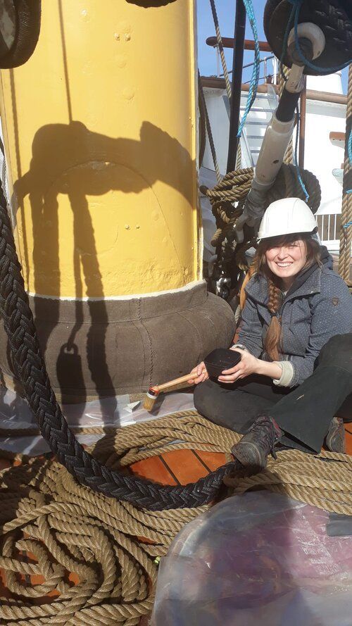 Først var vi ombord og lave skabeloner, der konverteres til kraver i 2 lag hørdug. Efter montering imprægneres og tætnes dugen med linolie og linoliemaling. Specielt brovspryds-kraven bød på lidt udfordringer, da intet er symmetrisk og vi måtte ligge ude i badekarret under processen.